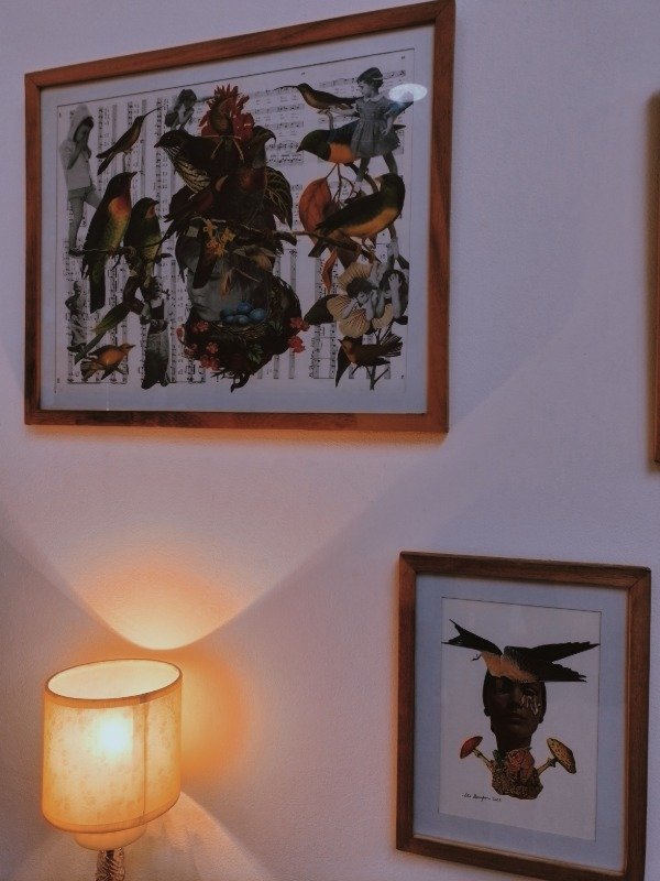 Este collage nació de un sueño que tuve. Pájaros, niñas y niños jugaban entre el follaje, dentro de una musica suave.